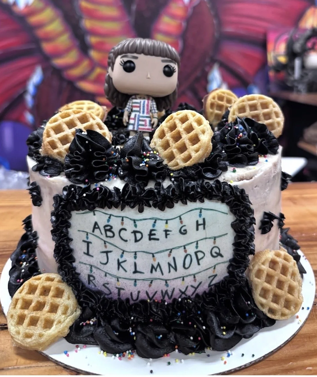 Our Starcourt Mall Cake is a bright yellow cake decorated in bold 80’s colors—teals, pinks, and electric blues—with retro piping and mall-inspired flair that feels straight out of a summer at Starcourt. The Upside Down Cake is a rich red velvet creation wrapped in dramatic black frosting and textured red vines, giving it that perfectly eerie, Hawkins-after-dark vibe. And for something sweet and nostalgic, our Butter & Honey Cake is light, moist, and topped with a drizzle of honey and mini waffles for a warm, comfort-food twist that feels like Eleven might approve after saving the world.